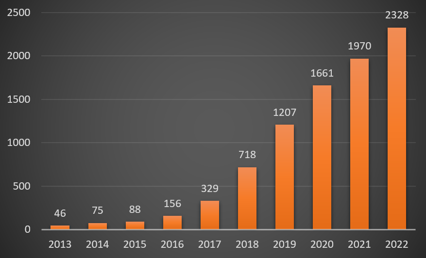 自2011年以來,人工智能(Artificial Intelligence,AI)技術(shù)經(jīng)歷了飛速發(fā)展,成功地跨越了科學(xué)與應(yīng)用之間的技術(shù)鴻溝,在圖像分類、語音識別、知識問答、無人駕駛等方面實現(xiàn)了重大的突破,進入了蓬勃發(fā)展的時期。而在天文學(xué)領(lǐng)域,AI的應(yīng)用也在逐年加速增長。通過對arXiv上涉及AI在天文研究方面的論文進行統(tǒng)計,發(fā)現(xiàn)從2013年的46篇增長到2022年的2328篇,十年間增長了50倍之多。