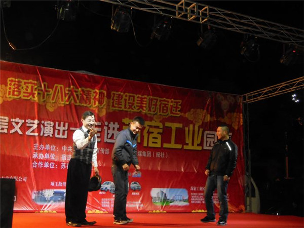 落實十八大精神 建設(shè)美好宿遷”服務基層文藝演出由市委宣傳部、宿遷報業(yè)傳媒集團(報社)主辦,宿遷新聞網(wǎng)承辦,旨在深入宣傳黨的十八大和市委四屆三次全體(擴大)會議精神,落實文化惠民措施,將走進全市100余個鄉(xiāng)鎮(zhèn)、社區(qū),將包括歌舞、雜技、曲藝、戲劇等內(nèi)容的百場精彩演出奉獻給廣大基層群眾,此次受園區(qū)邀請,專程赴園區(qū)公舍演出,為廣大工友及周邊居民帶來了一場精彩的文化大餐。