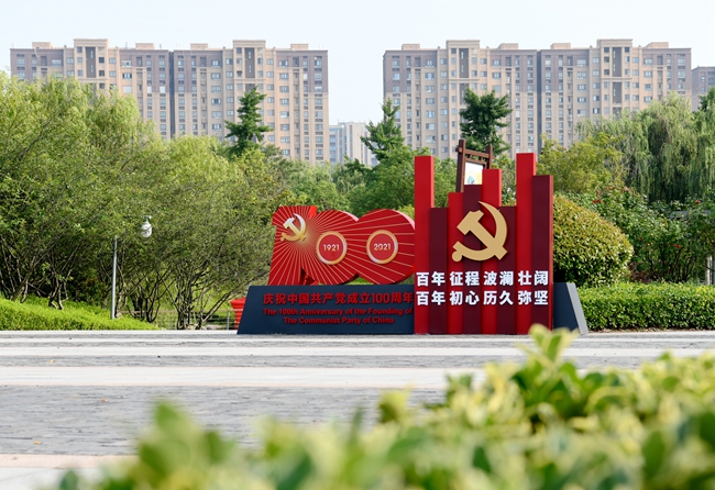在園區(qū)的廣場、公園、學(xué)校等處,“建黨一百周年”、“核心價(jià)值觀”、“中國夢”、“不忘初心”等主題雕塑隨處可見;園區(qū)主要道路節(jié)點(diǎn)鮮花綻放;青海湖西路燈桿懸掛國旗,公交站臺櫥窗張貼節(jié)日宣傳畫面,道路被鮮艷的紅色浸染,讓園區(qū)洋溢著喜慶、熱烈的節(jié)日氣氛。