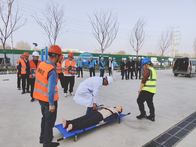 本次演練共分6個(gè)小組,分別為:現(xiàn)場(chǎng)模擬組、現(xiàn)場(chǎng)警戒(搶修)組、應(yīng)急救援(疏散)組、通訊聯(lián)絡(luò)組、事故調(diào)查組、 觀(guān)摩組。假設(shè)工人在生活區(qū)違規(guī)使用大功率電器突發(fā)火災(zāi),被煙霧和火勢(shì)圍困,二樓有人發(fā)出救援信號(hào),正在附近巡查的安全員發(fā)現(xiàn)情況后,立即趕赴現(xiàn)場(chǎng)并打電話(huà)給項(xiàng)目生產(chǎn)負(fù)責(zé)人,在接到通知后,項(xiàng)目生產(chǎn)負(fù)責(zé)人迅速安排項(xiàng)目部應(yīng)急救援辦公室負(fù)責(zé)人,并啟動(dòng)應(yīng)急預(yù)案,各救援小組立即到達(dá)現(xiàn)場(chǎng)開(kāi)展工作,安全員迅速引導(dǎo)全體人員有序從疏散樓梯疏散到安全位置,救援組帶著擔(dān)架、急救箱等趕赴現(xiàn)場(chǎng),將“受傷”人員用擔(dān)架從房?jī)?nèi)撤離到安全位置,同時(shí)救援醫(yī)生對(duì)“受傷”人員進(jìn)行簡(jiǎn)單的心肺復(fù)蘇、人工呼吸,并迅速送往醫(yī)院進(jìn)行治療。