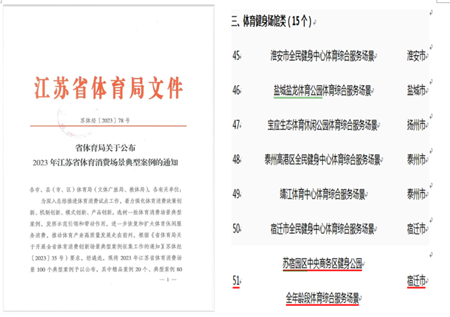 近日,江蘇省體育局印發(fā)《關(guān)于公布2023年江蘇省體育消費場景典型案例的通知》,遴選公布100個體育消費場景典型案例,其中精品案例20個、典型案例80個。蘇宿園區(qū)中央商務(wù)區(qū)健身公園全年齡段體育綜合服務(wù)場景入選2023年江蘇省體育消費場景典型案例。