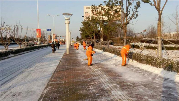 清晨6時,市政部工作人員和環(huán)衛(wèi)工人已經(jīng)開始對轄區(qū)部分主要路段進行除雪除冰作業(yè)。在凜冽寒風(fēng)中,他們不畏嚴(yán)寒,經(jīng)過近3 小時的清掃除冰,截至當(dāng)天上午9時,青海湖西路、通達大道、紫金山路等主干道及蘇州公園人行道已基本完成路面積雪清掃。